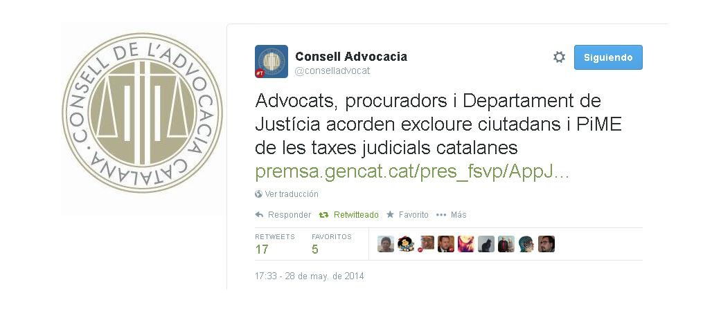 Tras las sentencia del Tribunal Constitucional, con fecha 28 de mayo de 2014 se ha llegado a un acuerdo entre operadores jurídicos y el Departament de Justicia de la Generalitat, a tenor del cual no se aplicarán las tasas judiciales catalanas a personas físicas y PYMES, además de convenirse otros extremos. Quedarán pues las tasas catalanas en los términos sobre exenciones subjetivas y hechos imponibles, y demás detalles recogidos en el acuerdo difundido por la siguiente nota de prensa oficial: enlace aquí, texto descargado aquí Acord_Taxes_Judicials_ADV_PRO_DEP.